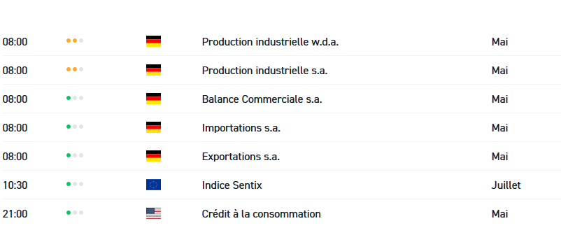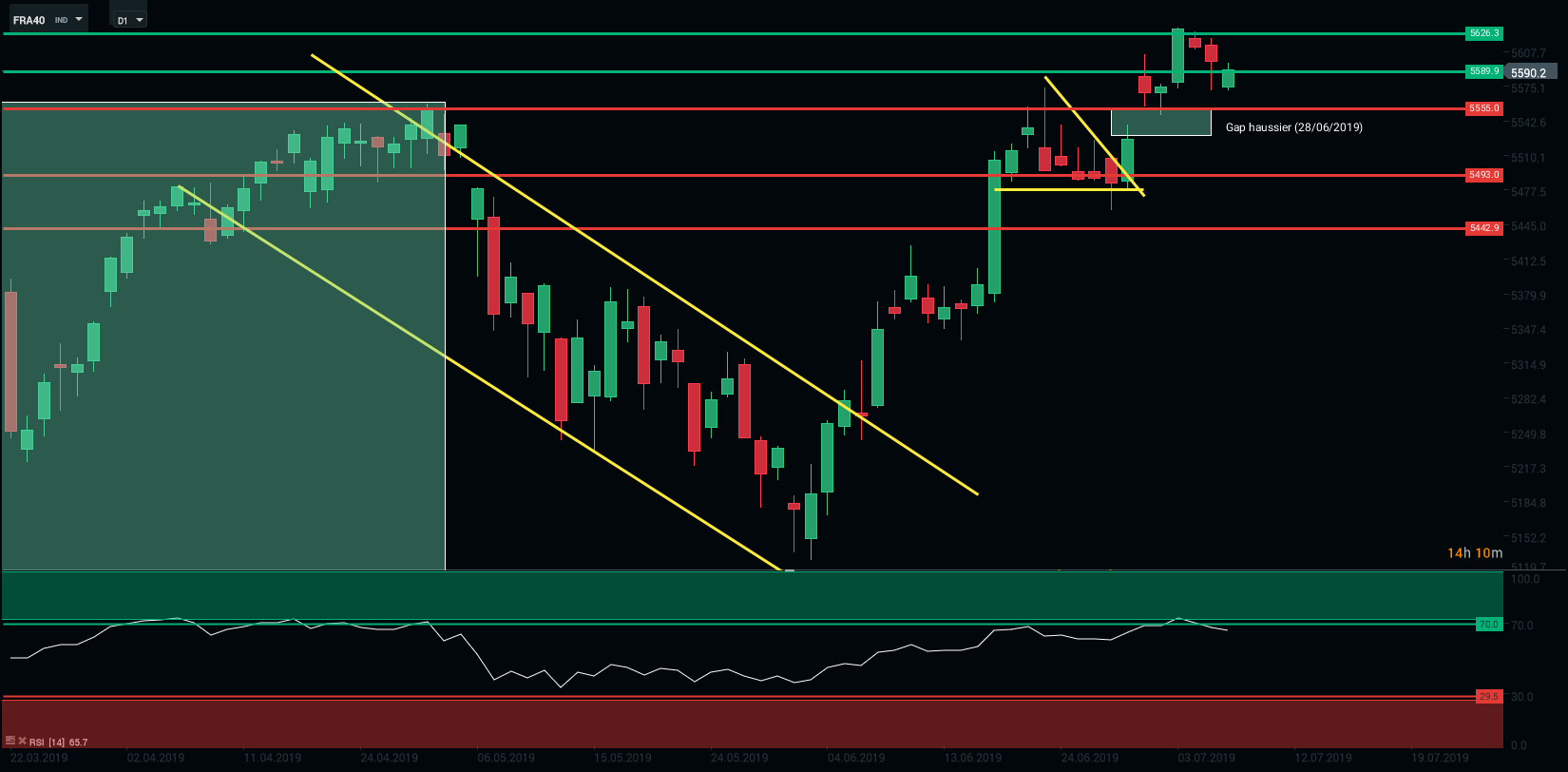 Paradoxalement, les marchés ont réagi négativement aux bonnes données américaines. L’économie américaine a créé plus d’emplois dans le secteur privé qu’anticipé par le consensus (en excluant le secteur agricole). Cette bonne nouvelle n’en est pas une pour les marchés actions. Et pour cause, nous devons avoir à l’esprit que la hausse observée en juin s’explique par les discours rassurant des présidents de la Fed et la BCE. Ces derniers ayant assuré qu’en cas de nécessité, les Banques centrales n’hésiteraient à prendre les mesures nécessaires. Ce qui a entrainé une chute des rendements des obligations d’Etat et une hausse des indices.