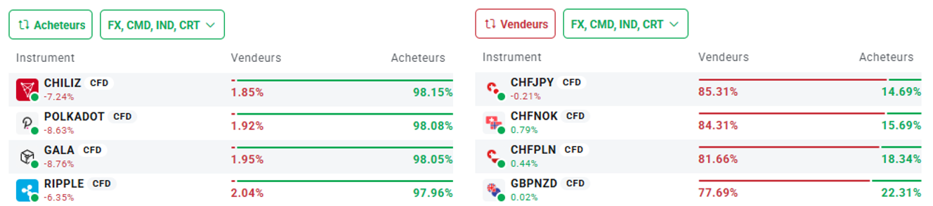 "Ce contenu est une communication marketing au sens de l'art. 24, paragraphe 3, de la directive 2014/65 /UE du Parlement européen et du Conseil du 15 mai 2014 concernant les marchés d'instruments financiers et modifiant la directive 2002/92 /CE et la directive 2011/61 /UE (MiFID II). La communication marketing n'est pas une recommandation d'investissement ou une information recommandant ou suggérant une stratégie d'investissement au sens du règlement (UE) n°596/2014 du Parlement européen et du Conseil du 16 avril 2014 sur les abus de marché (règlement sur les abus de marché) et abrogeant la directive 2003/6 / CE du Parlement européen et du Conseil et directives 2003/124 / CE, 2003/125 / CE et 2004/72 / CE de la Commission et règlement délégué (UE) 2016/958 de la Commission du 9 mars 2016 complétant le règlement (UE) n°596/2014 du Parlement européen et du Conseil en ce qui concerne les normes techniques de réglementation relatives aux modalités techniques de présentation objective de recommandations d'investissement ou d'autres informations recommandant ou suggérant une stratégie d'investissement et pour la divulgation d'intérêts particuliers ou d'indications de conflits d'intérêt ou tout autre conseil, y compris dans le domaine du conseil en investissement, au sens de l'article L321-1 du Code monétaire et financier. L’ensemble des informations, analyses et formations dispensées sont fournies à titre indicatif et ne doivent pas être interprétées comme un conseil, une recommandation, une sollicitation d’investissement ou incitation à acheter ou vendre des produits financiers. XTB ne peut être tenu responsable de l’utilisation qui en est faite et des conséquences qui en résultent, l’investisseur final restant le seul décisionnaire quant à la prise de position sur son compte de trading XTB. Toute utilisation des informations évoquées, et à cet égard toute décision prise relativement à une éventuelle opération d’achat ou de vente de CFD, est sous la responsabilité exclusive de l’investisseur final. Il est strictement interdit de reproduire ou de distribuer tout ou partie de ces informations à des fins commerciales ou privées. Les performances passées ne sont pas nécessairement indicatives des résultats futurs, et toute personne agissant sur la base de ces informations le fait entièrement à ses risques et périls. Les CFD sont des instruments complexes et présentent un risque élevé de perte rapide en capital en raison de l'effet de levier. 71% de comptes d'investisseurs de détail perdent de l'argent lors de la négociation de CFD avec ce fournisseur. Vous devez vous assurer que vous comprenez comment les CFD fonctionnent et que vous pouvez vous permettre de prendre le risque probable de perdre votre argent. Avec le Compte Risque Limité, le risque de pertes est limité au capital investi."
