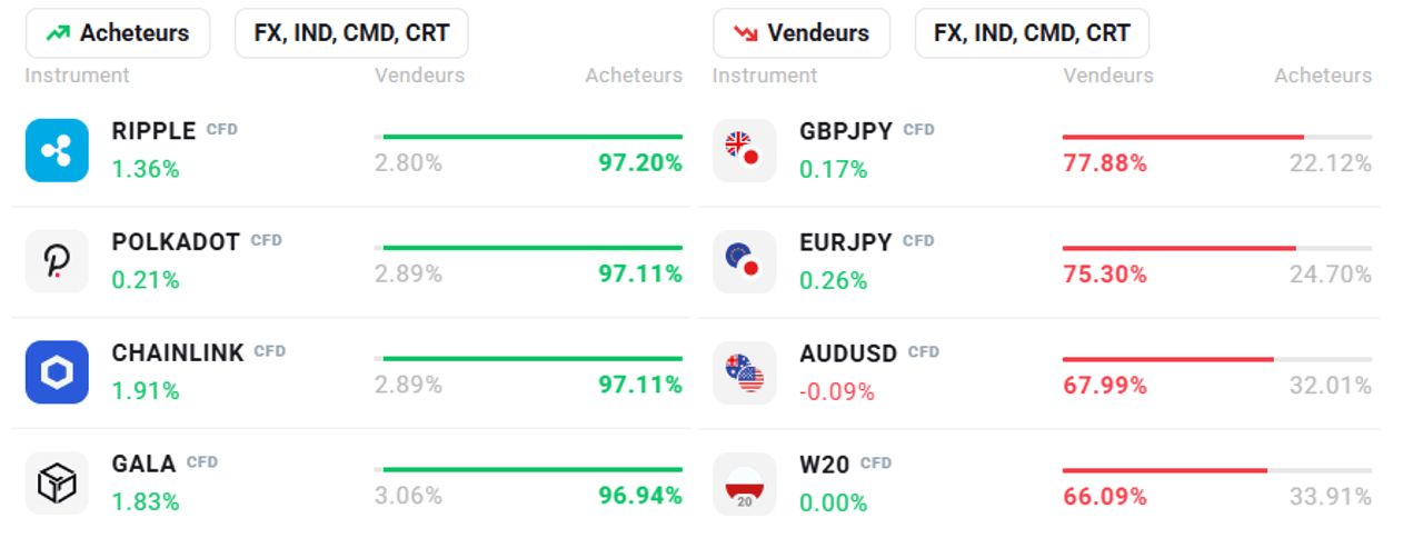 "Ce contenu est une communication marketing au sens de l'art. 24, paragraphe 3, de la directive 2014/65 /UE du Parlement européen et du Conseil du 15 mai 2014 concernant les marchés d'instruments financiers et modifiant la directive 2002/92 /CE et la directive 2011/61 /UE (MiFID II). La communication marketing n'est pas une recommandation d'investissement ou une information recommandant ou suggérant une stratégie d'investissement au sens du règlement (UE) n°596/2014 du Parlement européen et du Conseil du 16 avril 2014 sur les abus de marché (règlement sur les abus de marché) et abrogeant la directive 2003/6 / CE du Parlement européen et du Conseil et directives 2003/124 / CE, 2003/125 / CE et 2004/72 / CE de la Commission et règlement délégué (UE) 2016/958 de la Commission du 9 mars 2016 complétant le règlement (UE) n°596/2014 du Parlement européen et du Conseil en ce qui concerne les normes techniques de réglementation relatives aux modalités techniques de présentation objective de recommandations d'investissement ou d'autres informations recommandant ou suggérant une stratégie d'investissement et pour la divulgation d'intérêts particuliers ou d'indications de conflits d'intérêt ou tout autre conseil, y compris dans le domaine du conseil en investissement, au sens de l'article L321-1 du Code monétaire et financier. L’ensemble des informations, analyses et formations dispensées sont fournies à titre indicatif et ne doivent pas être interprétées comme un conseil, une recommandation, une sollicitation d’investissement ou incitation à acheter ou vendre des produits financiers. XTB ne peut être tenu responsable de l’utilisation qui en est faite et des conséquences qui en résultent, l’investisseur final restant le seul décisionnaire quant à la prise de position sur son compte de trading XTB. Toute utilisation des informations évoquées, et à cet égard toute décision prise relativement à une éventuelle opération d’achat ou de vente de CFD, est sous la responsabilité exclusive de l’investisseur final. Il est strictement interdit de reproduire ou de distribuer tout ou partie de ces informations à des fins commerciales ou privées. Les performances passées ne sont pas nécessairement indicatives des résultats futurs, et toute personne agissant sur la base de ces informations le fait entièrement à ses risques et périls. Les CFD sont des instruments complexes et présentent un risque élevé de perte rapide en capital en raison de l'effet de levier. 71% de comptes d'investisseurs de détail perdent de l'argent lors de la négociation de CFD avec ce fournisseur. Vous devez vous assurer que vous comprenez comment les CFD fonctionnent et que vous pouvez vous permettre de prendre le risque probable de perdre votre argent. Avec le Compte Risque Limité, le risque de pertes est limité au capital investi."