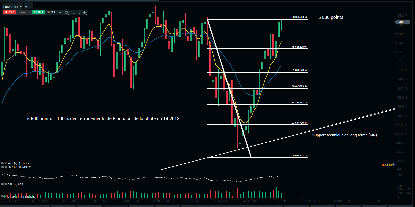 Même cas de figure que sur le DAX. Apres la forte chute du T4 2018, le CAC40 est parvenu à tutoyer les 100 % des retracements de Fibonacci (graphique hebdomadaire). Néanmoins, nous avons la ferme conviction que dans les échéances à venir les vendeurs réapparaitront de nouveau.