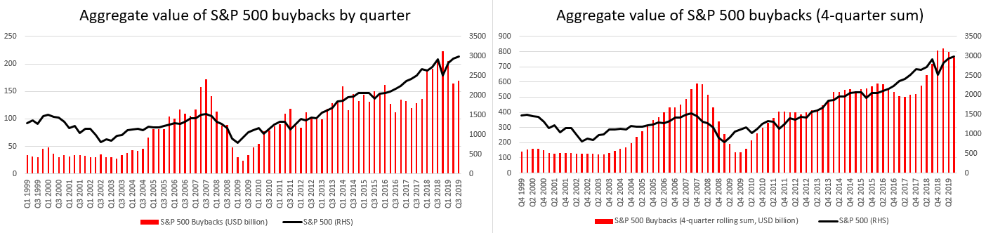 Les rachats du S&P 500 ont ralenti cette année après des hausses importantes en 2018. Toutefois, la valeur globale des actions rachetées augmente de nouveau, car la baisse des taux d'intérêt rend le financement moins coûteux. La valeur du troisième trimestre ne comprend que les sociétés qui ont déjà publié leurs résultats du troisième trimestre. Néanmoins, il est déjà plus élevé qu'au deuxième trimestre 2019. Source : Macrobond, Bloomberg, XTB Recherche