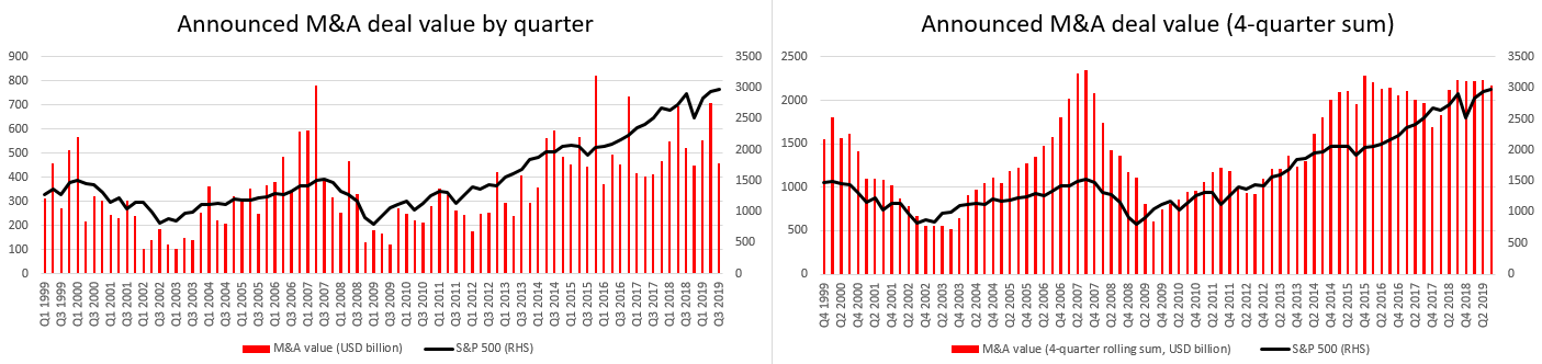 Avant de commenter les activités de fusions-acquisitions, il convient de noter que les données du quatrième trimestre 2019 n'ont pas été présentées dans le graphique ci-dessus car il reste encore plus d'un mois avant la fin du trimestre, de sorte que ces données seraient incomparables. Si l'on regarde le graphique ci-dessus, on peut voir que la valeur des opérations de fusions-acquisitions a culminé au début d'un trimestre de la crise de 200 et de la crise de 2008. A part cela, on constate que la valeur sur 4 trimestres des opérations de fusions-acquisitions annoncées, qui incluent au moins une société américaine, s'est stabilisée depuis le début du second semestre 2018. Cela signifie-t-il que les entreprises ont du mal à trouver un bon partenaire de fusion ou que des valorisations élevées rendent les opérations de fusions-acquisitions moins attrayantes ou que le marché boursier est sur le point de s'effondrer ? Pas nécessairement. La raison est probablement beaucoup plus simple : l'assouplissement de l'action en matière de fusions-acquisitions coïncide avec le début de la guerre commerciale sino-américaine, de sorte que les entreprises peuvent simplement reporter leurs décisions jusqu'à ce que la situation de l'économie mondiale soit plus claire.