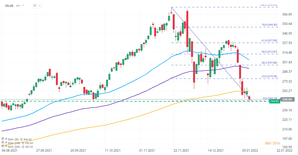 Zscaler (ZS.US) est tombé en dessous de l'EMA 200 (ligne or) et teste actuellement le plus bas du 4 octobre 2021. Les résistances les plus proches pour les actions de la société sont des niveaux proches du retracement Fibo de 23,6 %. Si les acheteurs ne parviennent pas à annuler les baisses actuelles, il est possible d'accélérer les baisses jusqu'à la zone des 228 dollars par action. Source : xStation 5