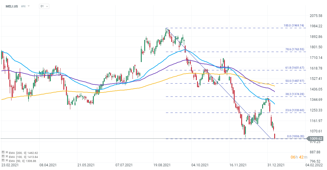 Les actions de MercadoLibre testent actuellement le creux du 6 décembre 2021. Si le côté acheteur ne parvient pas à stopper les baisses actuelles, une escalade des baisses et un nouveau test du seuil psychologique de 1 000 dollars par action sont possibles. La zone des 1 200 $ par action reste un niveau de résistance (retracement Fibo de 23,6 %). Source : xStation 5