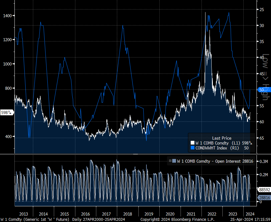 Les contrats à terme sur le blé de Chicago (CBOT) se négocient toujours dans la zone des 615 dollars le boisseau sur fond d'inquiétude quant au manque de pluie dans les régions productrices de blé des États-Unis et de la Russie, ainsi que dans la région de la mer Noire de ce dernier pays. Le dernier rapport du Commitment of Traders (CoT) à la CFTC (au 19 avril, données pour le 16 avril 2024) a montré que les grands spéculateurs avaient une très forte position courte sur le blé. Demain, les données CoT montreront comment cette situation a évolué entre le 16 et le 23 avril car les opérateurs s'attendent à ce que certains grands spéculateurs soient mis sous pression par la hausse des prix des récoltes et doivent couvrir leurs positions courtes, ce qui pourrait conduire à des prix encore plus élevés. Parallèlement, les prévisions météorologiques pour le Kansas, le Montana et le Dakota du Nord indiquent que les précipitations pourraient être plus importantes en mai qu'en avril et souvent supérieures à la moyenne des 30 dernières années (en particulier après le 8 mai).