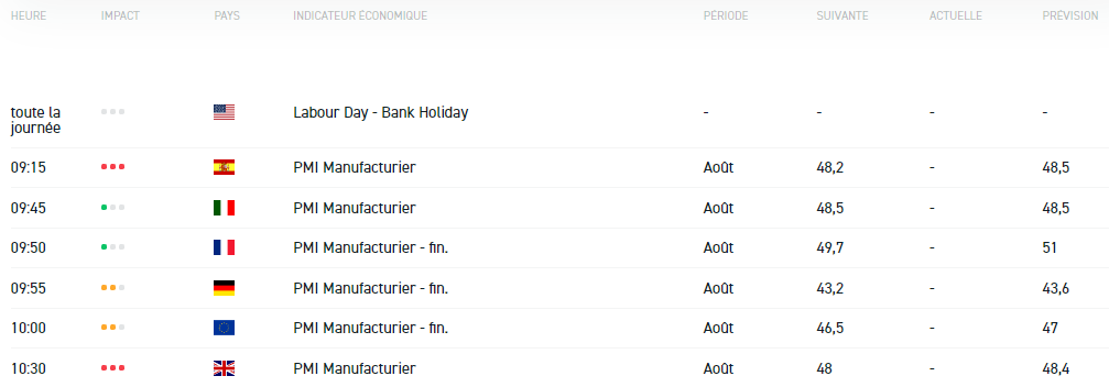 - Indice PMI manufacturier pour le mois d’août en France à 9h50