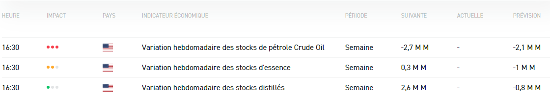 - Rapport du département américain de l’Energie sur la variation hebdomadaire des stocks de pétrole brut à 16h30