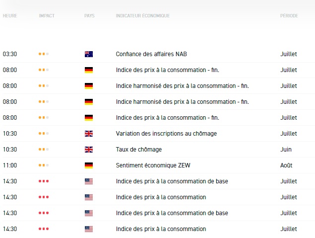 Les indices ont clôturé leur première séance de la semaine en net repli. Hormis le conflit commercial sino-américain, ce sont les tensions politiques qui ont dominé sur les marchés. Les manifestations à Hong Kong et la chute brutale du peso argentin ont entrainé le retour de l’aversion au risque en faveur des valeurs refuges. En Europe, une attention toute particulière sera portée aux chiffres du chômage au Royaume-Uni mais également au sentiment économique ZEW en Allemagne qui impactera fortement l’euro mais également le DAX30.