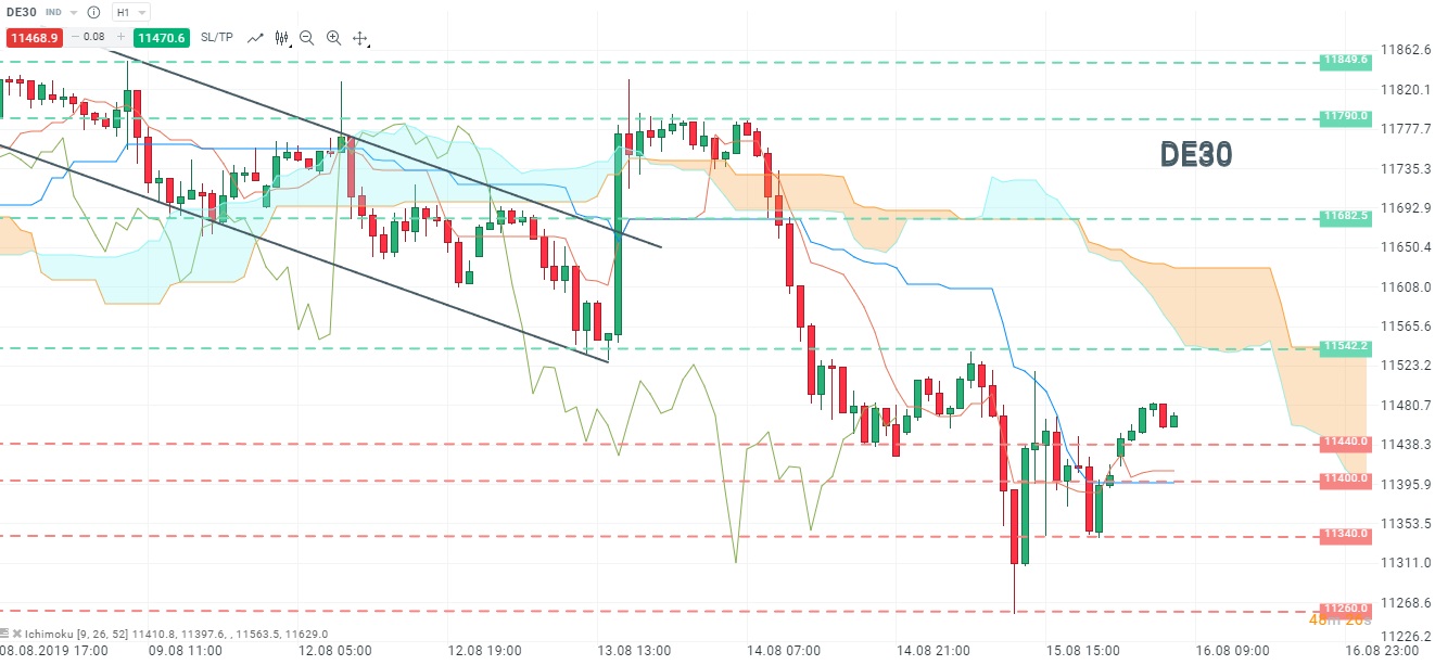 Le DAX30 (DE30) ce matin, en petite hausse après avoir touché un plus bas de février 2019 à 11260 pts