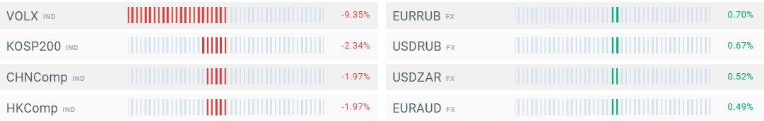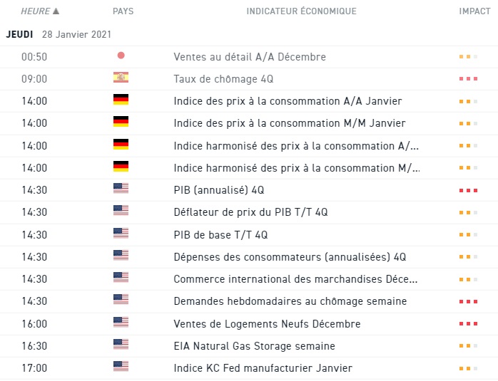 Les marchés boursiers américains ont chuté de manière significative hier. Le S&P 500 a chuté de 2,57%, le Dow Jones de 2,05%, le Nasdaq de 2,61% et le Russell 2000 de 1,91%. Ainsi Wall Street a connu sa pire séance depuis le mois d’octobre. Les attaques au “short squeeze” contre les hedge funds se poursuivent et les traders particuliers de Reddit multiplient les achats sur divers actions à petite capitalisation telles que GameStop (GME.US) (entraînant une hausse de 37% de l’indice USGAME), AMC Entertainment (AMC.US), BlackBerry (BB.US), Nokia (NOKIASEK.SE) et bien d’autres valeurs. La SEC a déclaré surveiller de près les marchés des options et des actions suite aux hausses massives des “small-caps”. Le FOMC a maintenu les taux inchangés lors du compte-rendu de la veille. J. Powell a déclaré que la politique monétaire restera souple, car la reprise économique s'est modérée récemment. Apple et Facebook ont dépassé les attentes suite à la publication de leurs résultats, et Tesla n’a pas atteint les attentes mais confirme son sixième trimestre consécutif de profits. Elon Musk a déclaré que la société vise un taux de croissance de 50% des livraisons en 2021. La séance sera marquée par la publication du PIB américain pour le quatrième trimestre 2020 mais également les rapports de résultats de 3 membres du Dow Jones : Dow, McDonald's et Visa.