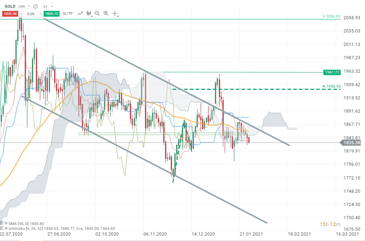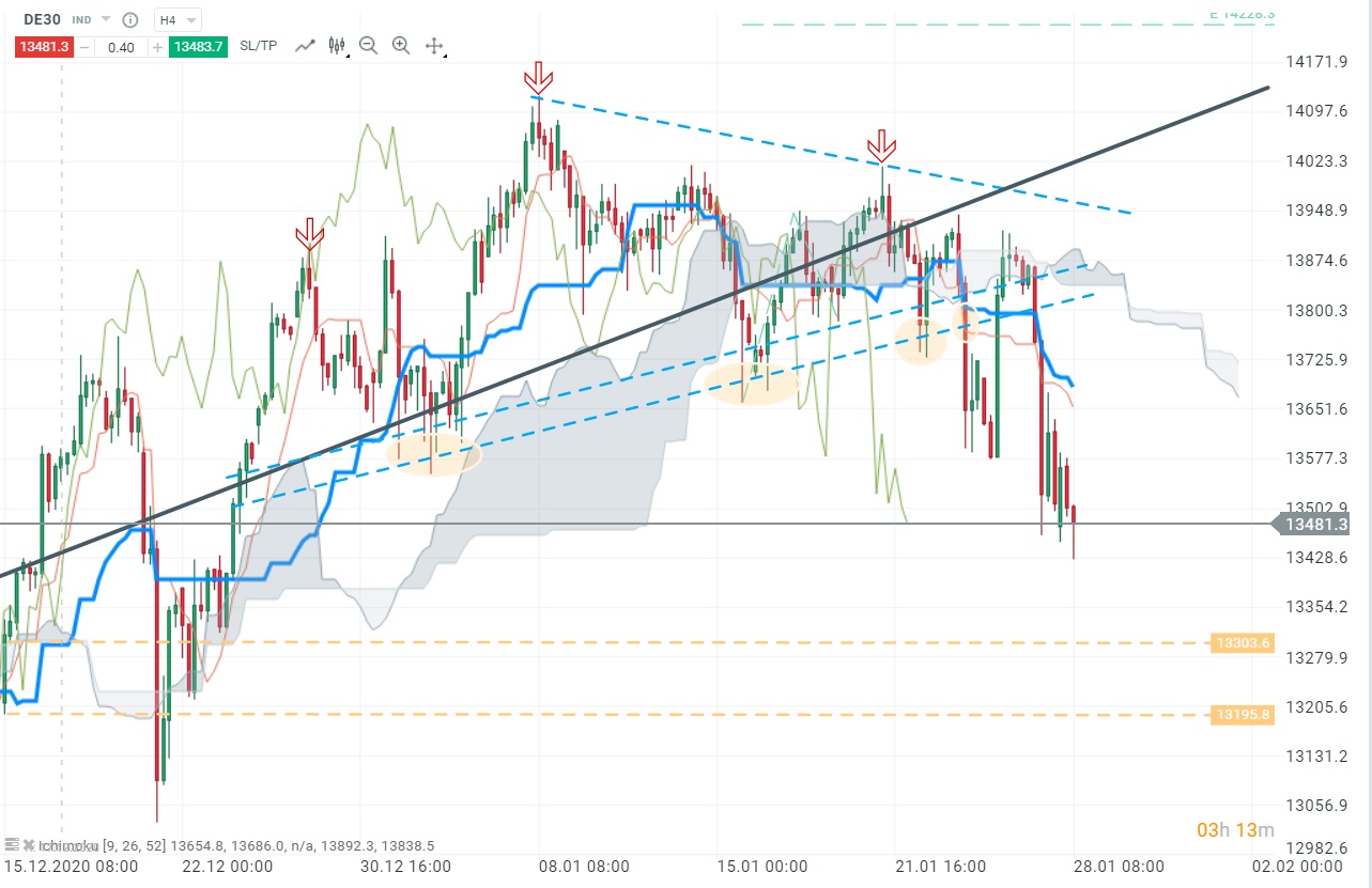 Opinion : La série de mauvaises nouvelles en provenance d’Allemagne (prévisions de croissance 2021 en baisse et maintient des restrictions) ont poussé les indices CAC40 et Dax vers leur objectif théorique respectifs issu des figures en épaule-tête-épaule. D’un point de vue technique, un rebond reste le plus probable, en revanche, en cas de cassure des 13 460 pts, le repli pourrait s’étendre vers les 13 000 pts. La vigilance est de mise sur les indices