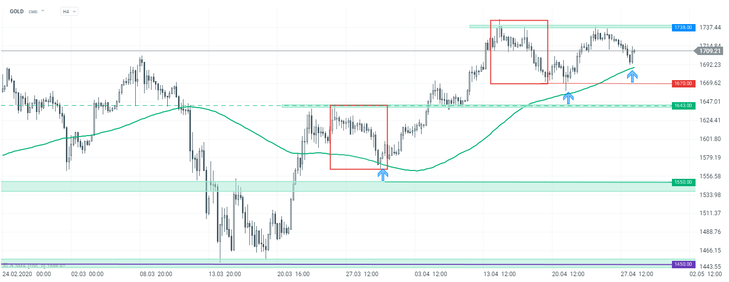 Commençons par le marché de l'or qui évolue à la hausse récemment. Malgré le sentiment à la hausse, le cours de ce métal précieux n'a pas atteint son plus haut niveau depuis le début de l'année et s'est retiré de la résistance à 1738 $. Néanmoins, les haussiers ne devraient pas être trop inquiets à moins qu'ils ne voient une cassure en dessous de la moyenne mobile à 100 périodes (en H4, ligne verte sur le graphique ci-dessous). Dans le cas où une cassure plus profonde se produit, les acheteurs devraient se concentrer sur la zone de 1670 $, où se situe la limite inférieure de la structure "d'Overbalance". Dernier point, mais non des moindres, une rupture sous la zone de 1643 $, marquée par des réactions antérieures sur les cours, pourrait opérer un changement dans le sentiment de marché à la baisse et annoncer une faiblesse plus importante.