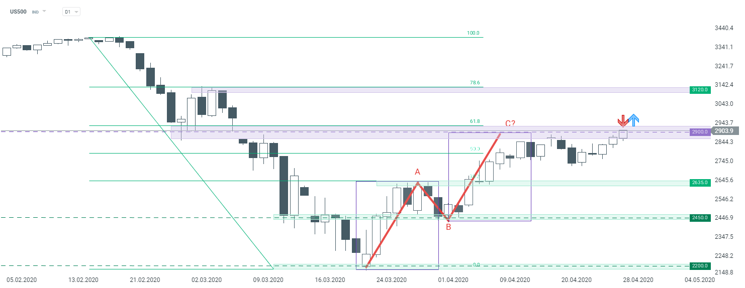 Enfin, regardons l'indice S & P500 (US500). Sur l'unité quotidienne, on peut voir que l'indice fait une correction à la hausse dans une tendance baissière. La récente tendance à la hausse s'est arrêtée dans la zone de résistance clé à 2 900 points. Cependant, le seuil est à nouveau testé. La zone susmentionnée est marquée par l'égalité des vagues A et C de la théorie des vagues d'Elliott. De plus, il est également marqué par les précédentes réactions des cours et le retracement de Fibonacci de 61,8% du récent mouvement à la baisse. La séance d'aujourd'hui sera cruciale et devrait déterminer l'orientation de la tendance à moyen terme. Tant que le cours se situe en dessous de 2900 points, le mouvement à la baisse semble être le scénario de base. Néanmoins, une cassure à la hausse pourrait conduire à un mouvement haussier plus important avec un niveau potentiel de 78,6% de Fibo (3 125 points).