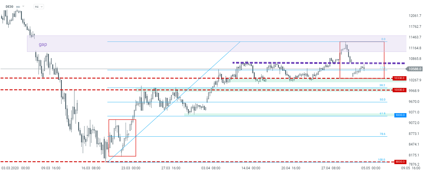 Les marchés boursiers européens se sont redressés à la fin de la semaine précédente. Cependant, l'indice allemand (DE30) a ouvert la semaine avec un gap baissier. Le récent mouvement haussier a été stoppé près du trou de cotations situé au 9 mars. Le rebond de ce niveau pourrait suggérer un retour à la tendance principale, qui reste à la baisse. Néanmoins, en regardant en H4, on peut voir que le marché se négocie dans un mouvement court terme à la hausse.Le mouvement à la baisse en cours peut être considéré comme juste une correction dans le cadre d'une grande impulsion à la hausse commencée le 19 mars. Un retour sous le seuil psychologique des 10 000 pourrait être un fort signal baissier. Par ailleurs, la zone de 10 330 points pourrait constituer un support important.