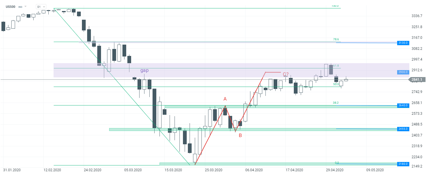 Enfin, regardons l'indice S & P500 (US500). En regardant le calendrier quotidien, on peut voir que l'indice se négocie en correction à la hausse dans une tendance à la baisse. Le mouvement haussier récent s'est arrêté légèrement au-dessus des 2 900 points, mais la zone de résistance n'a pas encore été brisée (zone marquée de couleur violette). La zone susmentionnée est marquée par l'égalité des vagues A et C de la théorie des vagues d'Elliott, les réactions de cours précédentes et le retracement de Fibonacci de 61,8% du récent mouvement à la baisse. Selon l'analyse technique classique, tant que le cours se situe en dessous de 2 900 points, le mouvement à la baisse semble être le scénario de base. Néanmoins, le rythme des baisses n'est pas important donc on ne peut pas exclure la possibilité d'une nouvelle attaque sur la résistance à 2 900 pts. En cas de cassure au-dessus, un mouvement haussier plus important pourrait suivre avec un niveau potentiel de 78,6% de Fibo (3,125 pts).
