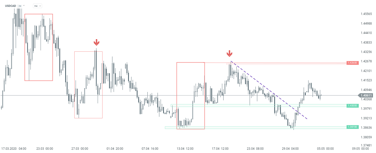 Commençons l'analyse d'aujourd'hui avec l'USDCAD. La paire a rebondi sur le support clé à 1,3870 et le mouvement à la hausse a été lancé par la suite. Les gains se sont accélérés une fois que la paire a dépassé la ligne de tendance à la baisse. Néanmoins, les acheteurs ont eu du mal au cours des derniers jours et la paire a livré une correction à la baisse. En cas d'approfondissement, la zone des 1,40 devrait être le premier support à surveiller. Cependant, une rupture en dessous pourrait déclencher une baisse plus profonde, avec 1,3870 comme cible possible. En revanche, si le sentiment haussier devait prévaloir cette semaine, la résistance à 1.4260 pourrait être menacée. Ce niveau est marqué par la limite supérieure de la structure "d'Overbalance" et les sommets précédents du 21 avril.