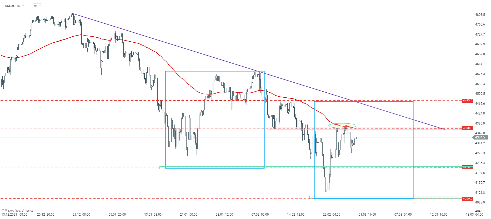 Enfin, jetons un coup d'œil au graphique de l'US500. L'indice américain s'est également négocié à la baisse récemment. La récente correction haussière s'est arrêtée au niveau de la résistance à 4 370 pts, qui est marquée par la moyenne mobile à 100 périodes et les réactions précédentes des prix. Si le sentiment baissier actuel prévaut, une baisse des prix visant le support à 4 220 points pourrait être envisagée. D'autre part, si une correction haussière plus importante se produit, la prochaine résistance à surveiller se situe à 4 475 pts, où se trouve la limite supérieure de la structure 1:1. En outre, il convient de prêter attention à la ligne de tendance baissière, qui peut également faire office de résistance.