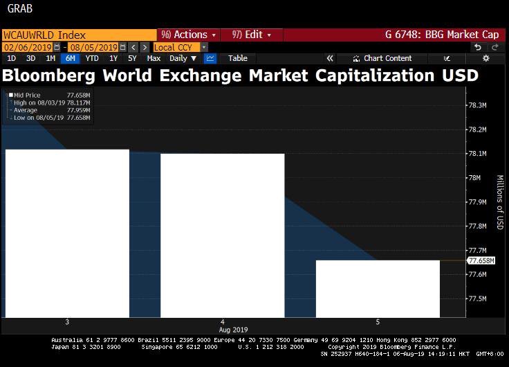 Hier fut la pire journée de l’année 2019 pour l’ensemble des places boursières mondiales : ce sont plus environ 4.4 trillions de dollars de capitalisation boursière qui se sont envolés (4,400 milliards de dollars). La principale cause de cette chute généralisée des indices : la manipulation de la devise chinoise par la Banque populaire de Chine (BPOC) matérialisant une nouvelle escalade dans les tensions commerciales entre Washington et Pékin.