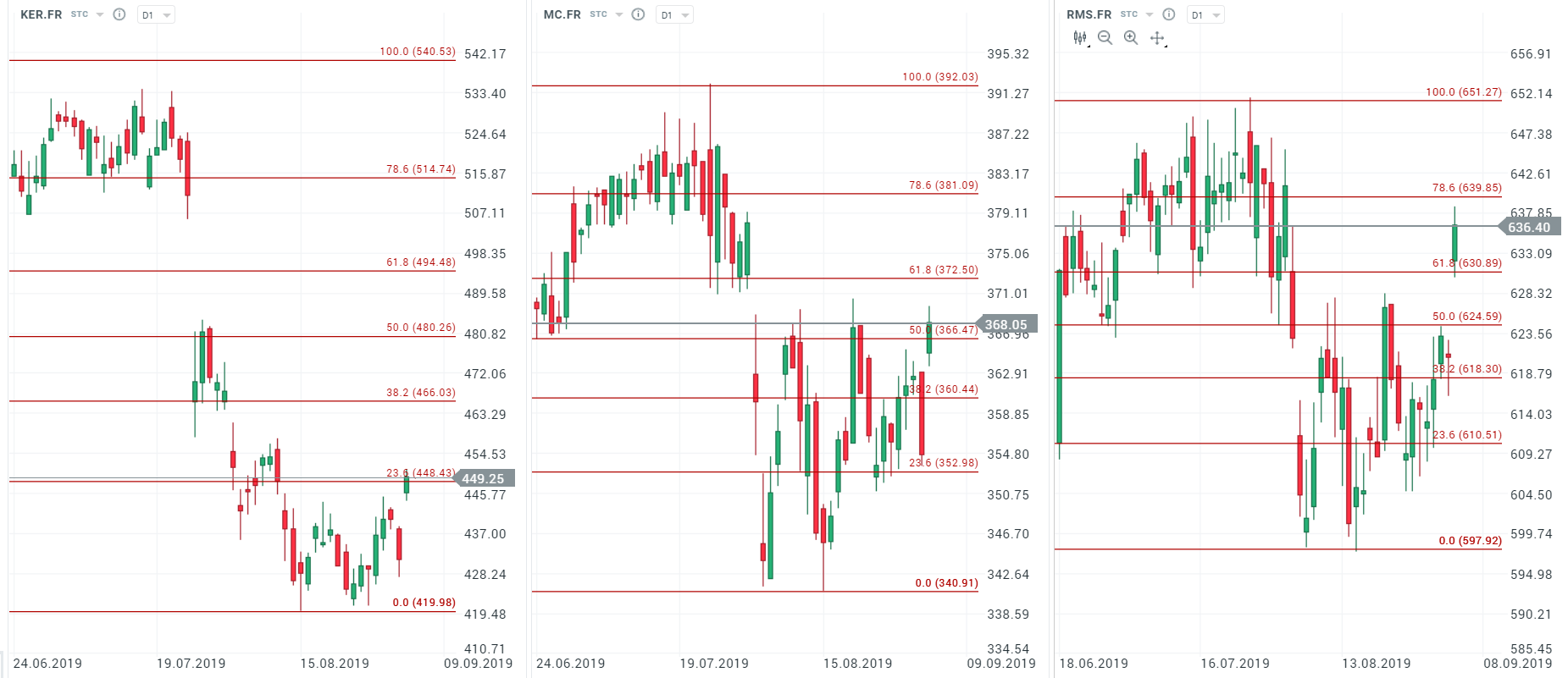 Représentation graphique des actions de Kering, LVMH et Hermès.