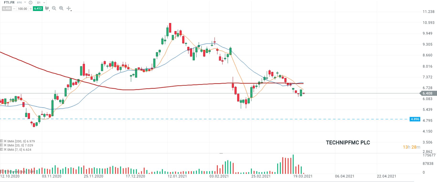 Il semble que l’impact du blocage du Canal de Suez n’ait eu qu’un impact de courte durée, puisque les cours de TechnipFMC PLC (FTI.FR) évoluent aujourd’hui à la baisse et se dirigent vers le creux du 25/02 à 5,939 au moment de la rédaction de ces lignes. Si le sentiment actuel prévaut, une cassure en dessous de ce niveau entraînerait un approfondissement de la baisse au niveau de la précédente zone de support vers les 4,896. Source : xStation5