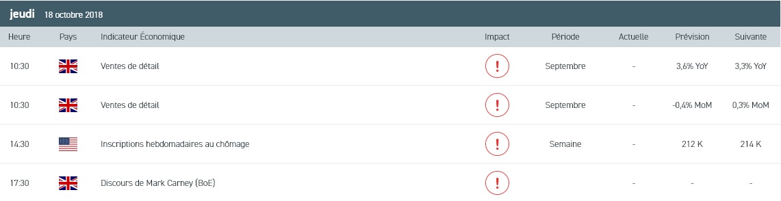 Une fois de plus, les indices européens ont ouvert en baisse ce matin dans le sillage des marchés chinois et de Wall Street. Au chapitre des changes, le dollar US continue de se renforcer face à son panier de devises après la publication du dernier compte-rendu (« Minutes ») de politique monétaire du FOMC (Réserve fédérale). Concernant le calendrier économique de ce jeudi, nous nous intéresserons aux ventes au détail au titre du mois de septembre au Royaume-Uni et à l’indice d’activité manufacturière dans la région de Philadelphie (Etats-Unis). Sur le front des entreprises, la saison des résultats se poursuivra avec les présentations d’American Express, PPG Industries, PayPal et de Travelers.