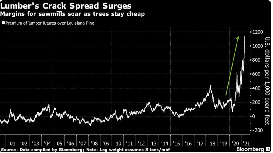Les prix du bois aux États-Unis s'envolent. Cela affectera également les perspectives d'inflation future aux États-Unis. Source : Bloomberg