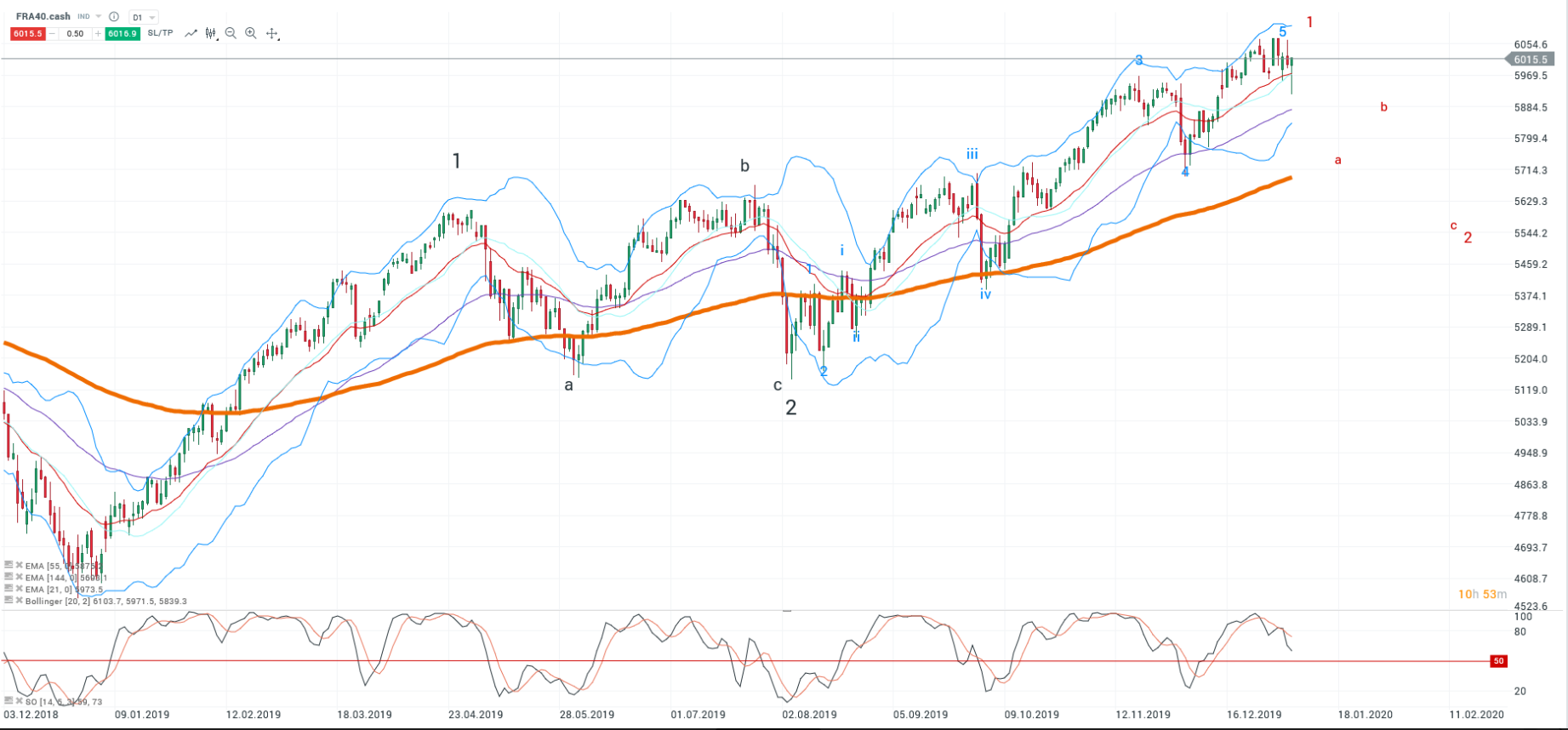 Le CAC40 reste très fort, malgré le flux d’information ambiante, sa construction graphique indique qu’il est solidement ancré dans la hausse à moyen terme. Il semble néamnoins qu’il puisse entamer un vague de correction baissière, respectant ainsi la théorie des vagues. Cette vague correctrice est inscrite dans un vaste décompte haussier. Ce dernier intermédiaire rend probable un début de vague déclinée en 3 temps. Un bivouac est ciblé sur la zone des 5750/5710 pour la vague « a ». La « b » entre 5910 et 5875 et la C terminale attendue dans la zone des 5580/5480 et un approfondissement en extension possible sur 5350 ( à définir « si » le moment venu) Invalidation du décompte si les prix dépassent les 5069.90 sur le CAC 40 cash tradé sur Xstation