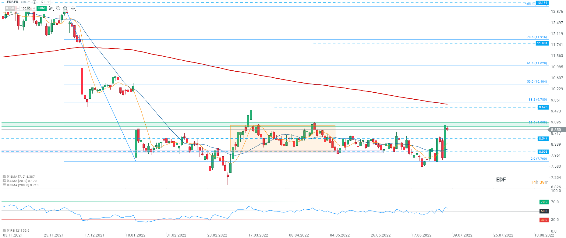 Les cours d’EDF (EDF.FR) ont ouvert à la baisse et se replient au contact de la résistance à 9,008 où coïncide le retracement de Fibonacci à 23,6% de la baisse de décembre 2021 en direction du support à 8,544. Toutefois, on remarque que le RSI évolue au-dessus de la zone de neutralité de 50 ce qui signifie que les acheteurs ont l’avantage et que le mouvement haussier pourrait reprendre. Source : xStation5
