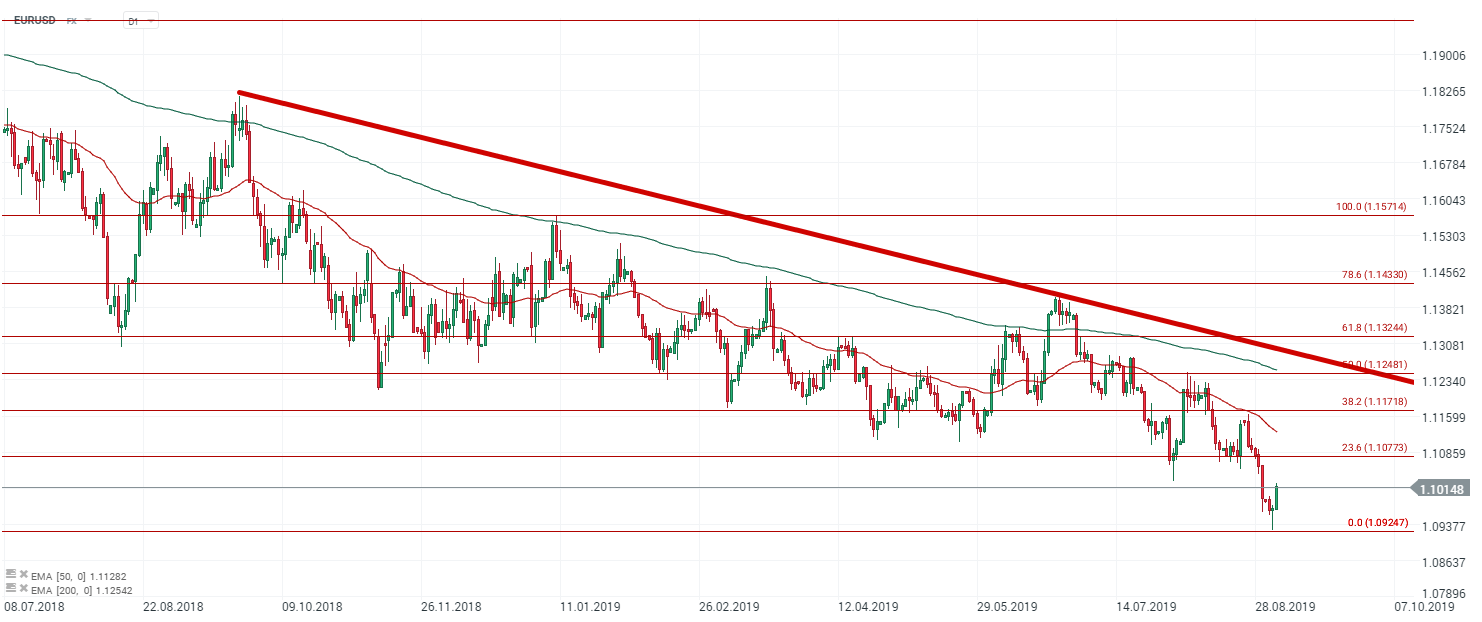 Mais c’est également la faiblesse du dollar qui profite à la monnaie unique. Après avoir atteint un nouveau plus haut de deux ans, le billet vert recule aujourd’hui, notamment suite aux propos de Donald Trump. Les anticipations d’une nouvelle baisse de taux de la Réserve fédérale le 18 septembre prochain ont encore augmenté : selon le CME FedWatch, les investisseurs anticipent une réduction de la fourchette des taux fédéraux de 25 points de base (à 90.4 %) et une réduction de 50 points de base (à 9.6 %). A ce sujet, James Bullard (Président de la Fed de Saint Louis) a préconisé une baisse de 50 points de base afin que la Fed réponde aux attentes du marché.