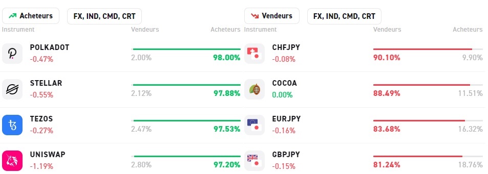 "Ce contenu est une communication marketing au sens de l'art. 24, paragraphe 3, de la directive 2014/65 /UE du Parlement européen et du Conseil du 15 mai 2014 concernant les marchés d'instruments financiers et modifiant la directive 2002/92 /CE et la directive 2011/61 /UE (MiFID II). La communication marketing n'est pas une recommandation d'investissement ou une information recommandant ou suggérant une stratégie d'investissement au sens du règlement (UE) n°596/2014 du Parlement européen et du Conseil du 16 avril 2014 sur les abus de marché (règlement sur les abus de marché) et abrogeant la directive 2003/6 / CE du Parlement européen et du Conseil et directives 2003/124 / CE, 2003/125 / CE et 2004/72 / CE de la Commission et règlement délégué (UE) 2016/958 de la Commission du 9 mars 2016 complétant le règlement (UE) n°596/2014 du Parlement européen et du Conseil en ce qui concerne les normes techniques de réglementation relatives aux modalités techniques de présentation objective de recommandations d'investissement ou d'autres informations recommandant ou suggérant une stratégie d'investissement et pour la divulgation d'intérêts particuliers ou d'indications de conflits d'intérêt ou tout autre conseil, y compris dans le domaine du conseil en investissement, au sens de l'article L321-1 du Code monétaire et financier. L’ensemble des informations, analyses et formations dispensées sont fournies à titre indicatif et ne doivent pas être interprétées comme un conseil, une recommandation, une sollicitation d’investissement ou incitation à acheter ou vendre des produits financiers. XTB ne peut être tenu responsable de l’utilisation qui en est faite et des conséquences qui en résultent, l’investisseur final restant le seul décisionnaire quant à la prise de position sur son compte de trading XTB. Toute utilisation des informations évoquées, et à cet égard toute décision prise relativement à une éventuelle opération d’achat ou de vente de CFD, est sous la responsabilité exclusive de l’investisseur final. Il est strictement interdit de reproduire ou de distribuer tout ou partie de ces informations à des fins commerciales ou privées. Les performances passées ne sont pas nécessairement indicatives des résultats futurs, et toute personne agissant sur la base de ces informations le fait entièrement à ses risques et périls. Les CFD sont des instruments complexes et présentent un risque élevé de perte rapide en capital en raison de l'effet de levier. 71% de comptes d'investisseurs de détail perdent de l'argent lors de la négociation de CFD avec ce fournisseur. Vous devez vous assurer que vous comprenez comment les CFD fonctionnent et que vous pouvez vous permettre de prendre le risque probable de perdre votre argent. Avec le Compte Risque Limité, le risque de pertes est limité au capital investi."