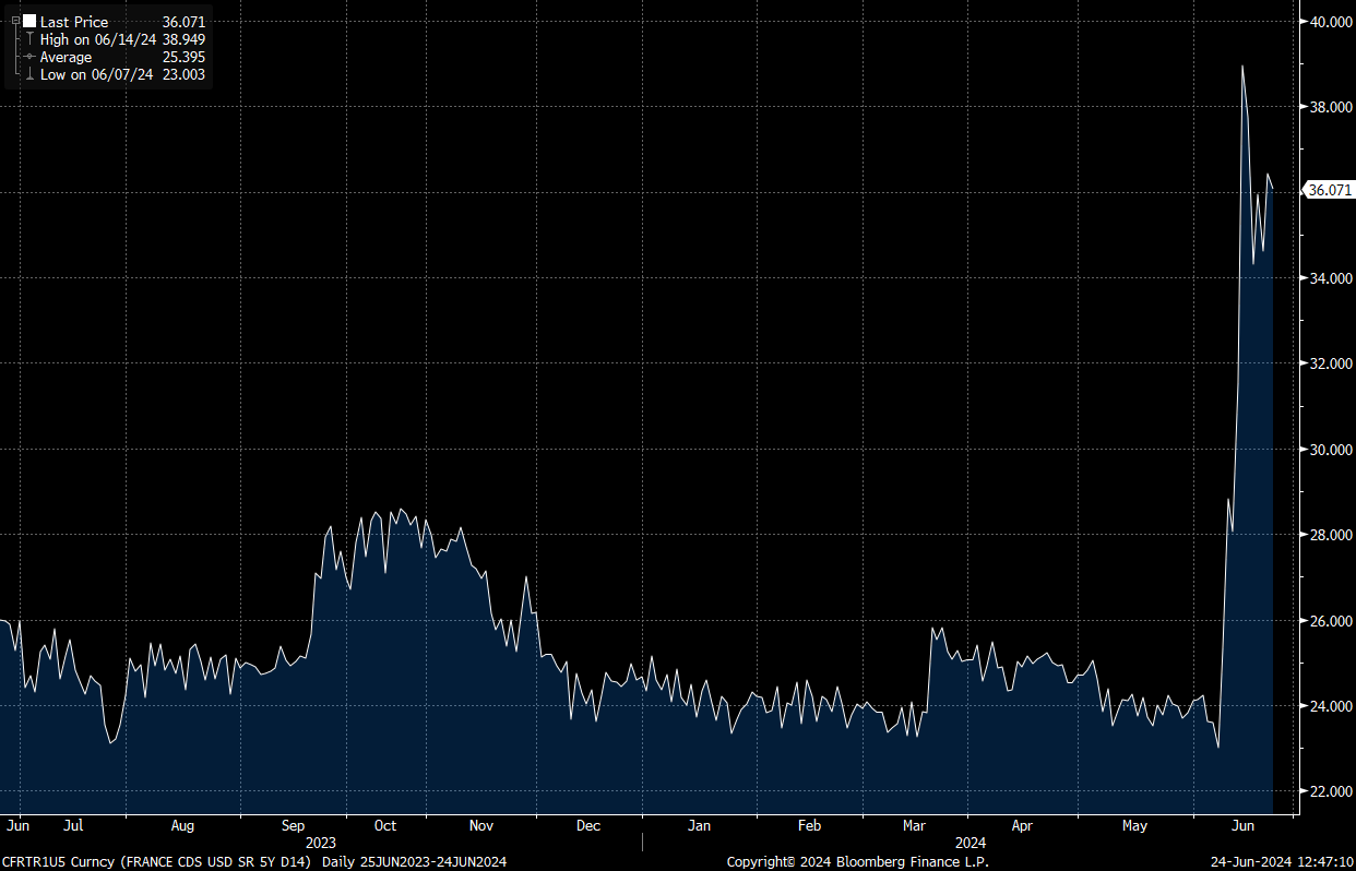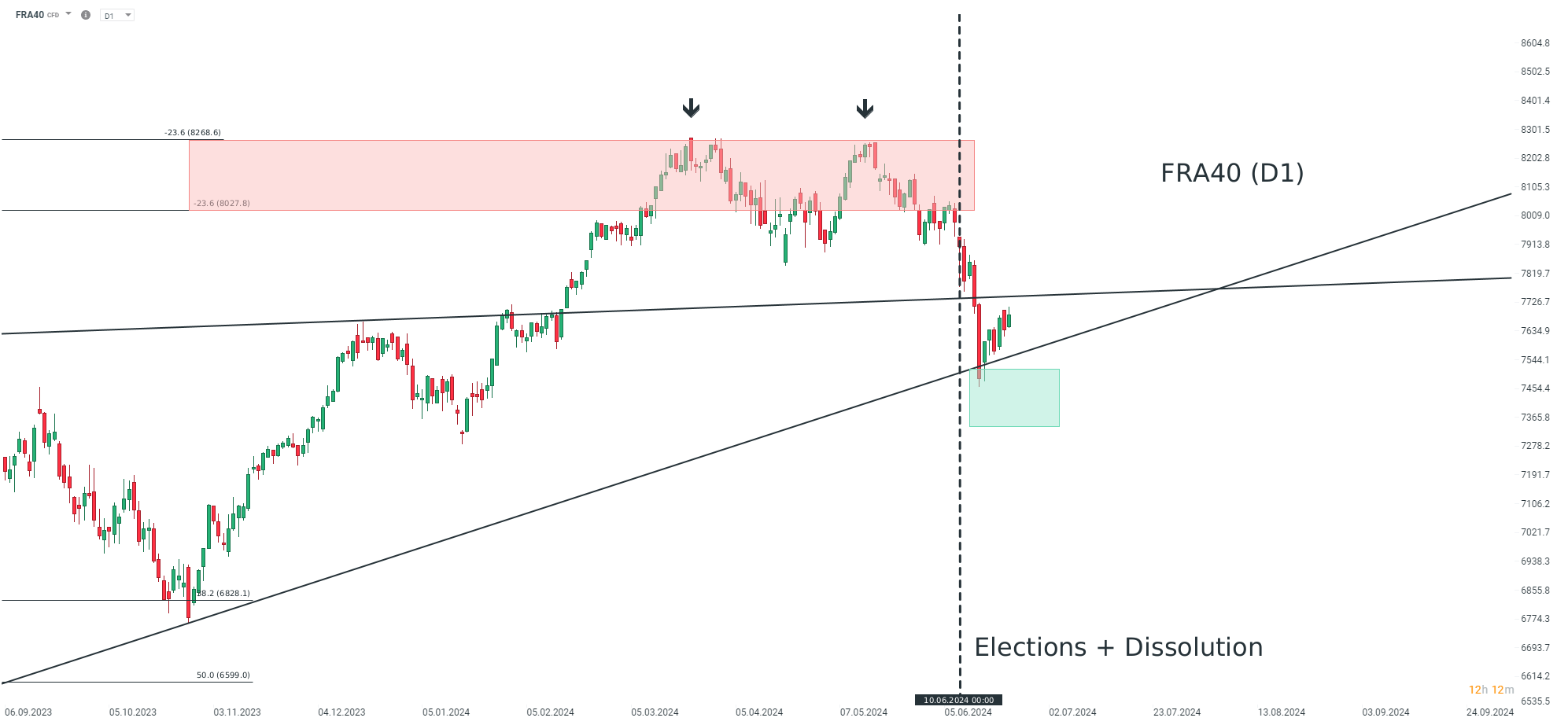 Le taux obligataire à 10 ans français est en tendance haussière en 2024. Les prix sont parfaitement compris dans un canal ascendant qui devra être cassé à la baisse pour que ce coup de théatre politique soit considéré au final comme un non-événement. Il faudra pour cela casser le niveau clé des 3,05% sans quoi la dette française sera exposée à des attaques spéculatives.