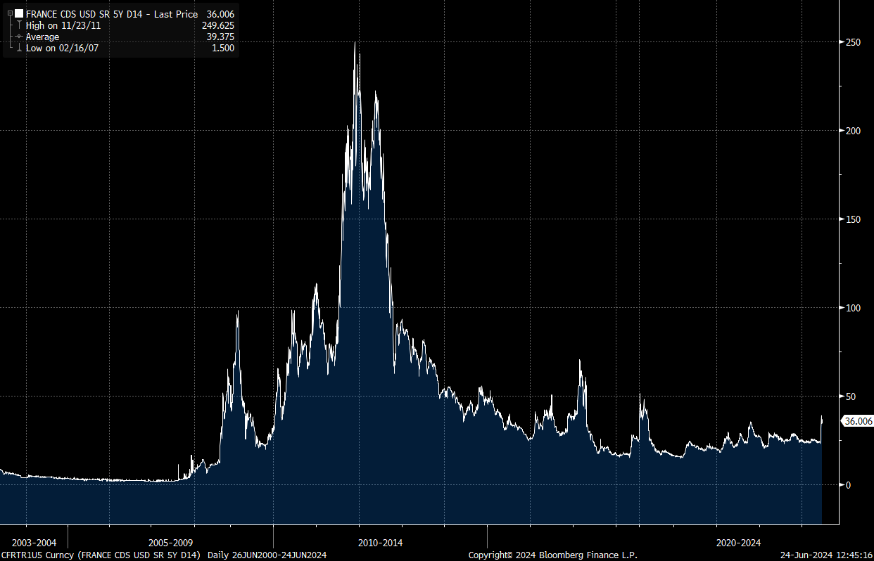 L’augmentation du risque de défaut sur la dette française, matérialisée par son CDS (credit default swap), est considérable sur le court-terme, mais négligeable en prenant du recul :
