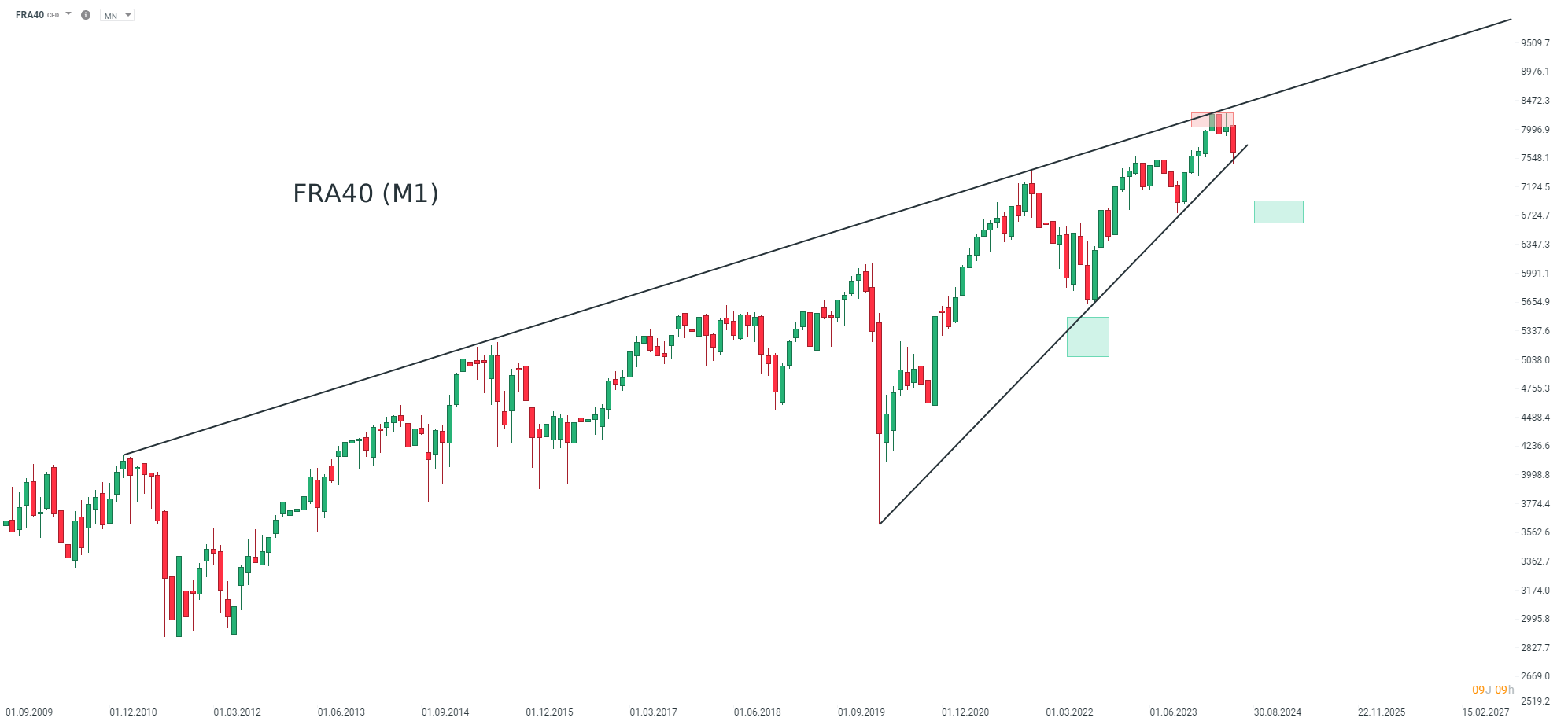 Zone de résistance majeure dans FRA40 en période M1, graphique généré le 21 juin 2024. Source : xStation.