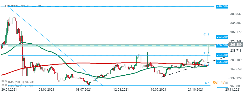 Le prix du Litecoin a dépassé la résistance majeure au niveau de 260,00 $ après un rallye de plus de 35 % cette semaine, surpassant la plupart des autres crypto-monnaies principales. Si le sentiment actuel prévaut, la prochaine cible pour les acheteurs est située à 293,00 $ et est marquée par un retracement de Fibonacci de 61,8% de la dernière correction à la baisse. Source : xStation5