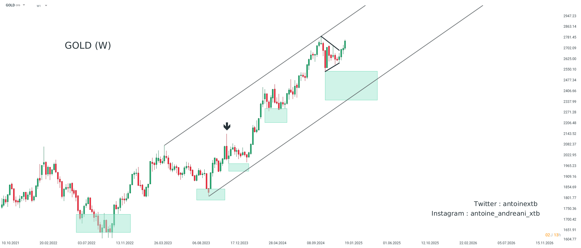 Les indices US et allemand sont au zénith. Depuis le 15 janvier, les taux obligataires US à 10 ans déclinent entraînant ceux français et allemand à la baisse. Le prix du pétrole diminue également (-6% environ depuis le 15 janvier). Imperturbable, l’or poursuit sa montée avec avoir cassé son triangle à la hausse. Les traders institutionnels ciblent les 2940 dollars. Source : xStation.