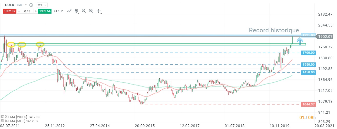 Le GOLD en données hebdomadaires, formation en "rounding bottom". L'or est maintenant en hausse de plus de 25 % par rapport aux plus bas du mois de mars. Source : xStation5