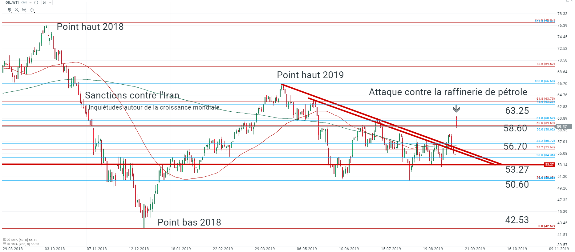 Cette semaine est placée sous le signe de la Réserve Fédérale puisque le FOMC se réunit à partir de demain et jusqu’à mercredi et pourrait décider d’une nouvelle baisse de taux, dans le sillage de la Banque centrale européenne. Pourtant c’est bel et bien le pétrole qui lui vole la vedette en ce début de semaine. Suite aux attaques perpétrées contre la raffinerie de pétrole d’Abqaiq en Arabie saoudite, les cours du pétrole se sont envolés hier soir lors de l’ouverture : le WTI gagnant plus de 9% au-dessus des 60$, le Brent affichant une hausse de près de 16% proche des 70$ le baril.