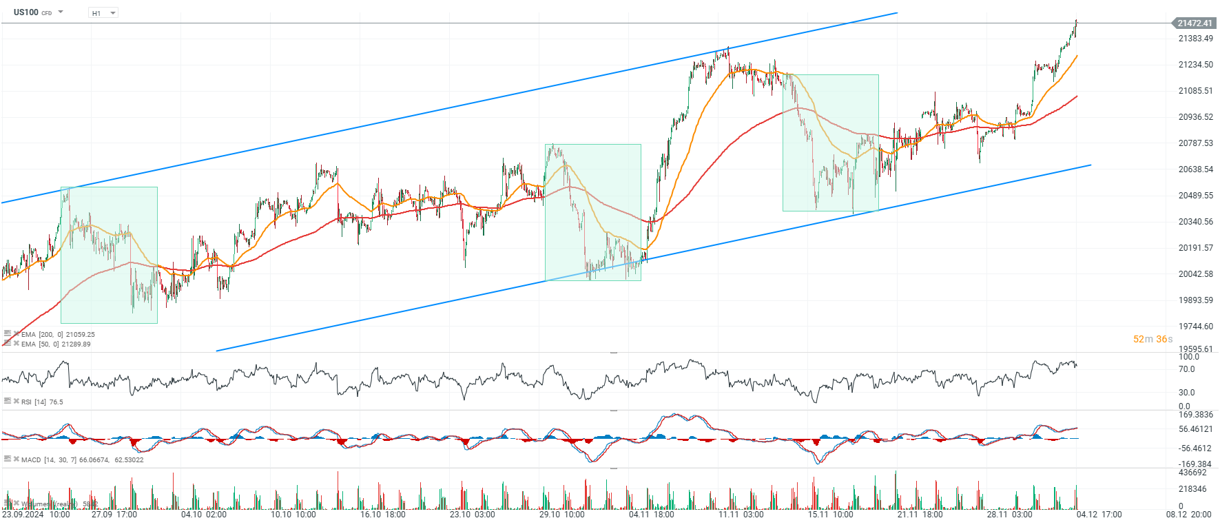 Le sentiment du marché boursier américain reste résolument positif. Bien que les secteurs financiers, bancaires et de l’énergie soient en difficulté, les entreprises technologiques tirent les indices américains vers le haut. Le contrat Nasdaq100 (US100) atteint des niveaux historiques, franchissant les 21 500 points. Le dollar américain perd 0,2 % après un ISM des services inférieur aux attentes ; l'indice USDIDX recule à 106,1.