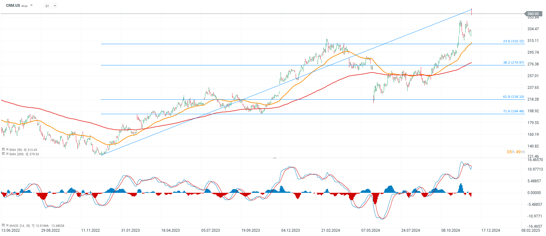 - Au troisième trimestre de l'année, le chiffre d'affaires de l'entreprise a augmenté de 8 % par rapport à l'année précédente, atteignant 9,44 milliards de dollars, contre une hausse de 25 % du bénéfice par action, qui s’élève à 1,58 USD, contre 1,25 USD au troisième trimestre 2023. Salesforce a relevé l'extrémité inférieure de ses prévisions de bénéfices pour l'ensemble de l'année, estimant des ventes entre 37,8 et 38 milliards de dollars, contre 37 à 38 milliards précédemment, et un bénéfice par action compris entre 6,16 et 6,20 USD, contre 6,05 à 6,13 USD auparavant. Wall Street prévoit un chiffre d'affaires de 37,87 milliards de dollars et un bénéfice par action de 6,16 USD ; en toute discrétion, les investisseurs espèrent que Salesforce dépassera ces résultats.