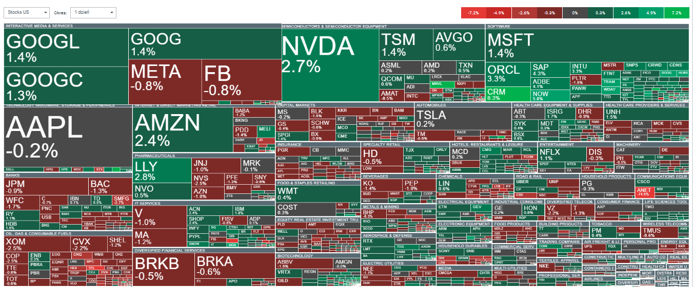 Aujourd'hui, les secteurs des logiciels et des semi-conducteurs rebondissent clairement ; le secteur technologique soutient Wall Street. Fait intéressant, une enquête menée par Salesforce a révélé un optimisme considérable autour des solutions d’IA chez les petites et moyennes entreprises, qui attribuent en grande partie l'augmentation de leurs profits à cette nouvelle technologie. Source : xStation5