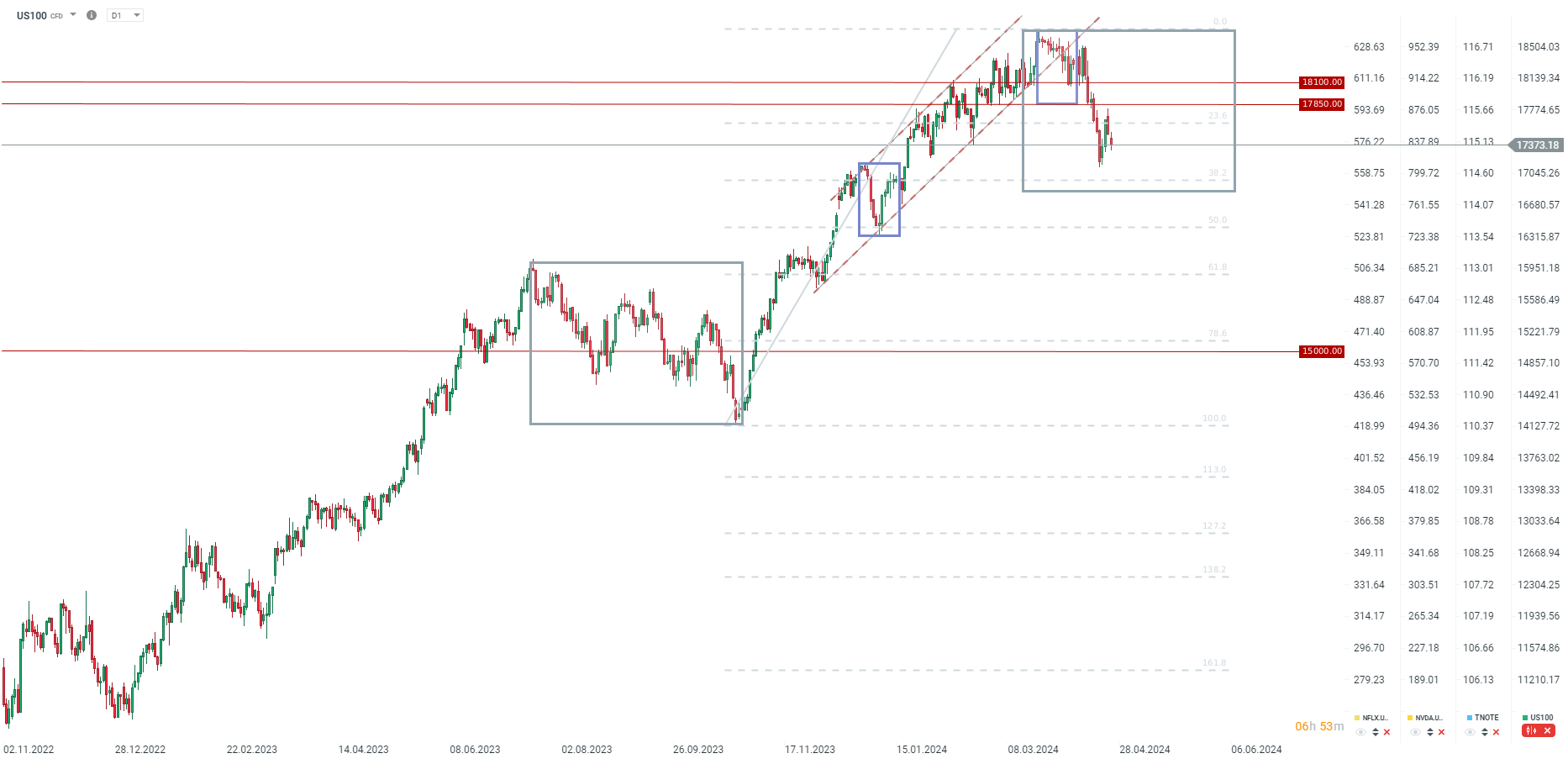 L'US100 perd près de 1 % aujourd'hui tandis que l'indice Nasdaq cash perd jusqu'à 1,6 %, ce qui est bien sûr lié aux pertes subies par Meta et d'autres sociétés liées à la technologie. L'US100 a perdu plus de la moitié de son récent rebond et de nombreux éléments indiquent qu'il pourrait y avoir une nouvelle tentative de redescendre vers les 17 000 points. Un peu plus bas se trouve le retracement de 38,2 de la dernière vague haussière de Fibonacci et l'ampleur d'une correction majeure dans la tendance haussière qui dure depuis l'automne 2022.