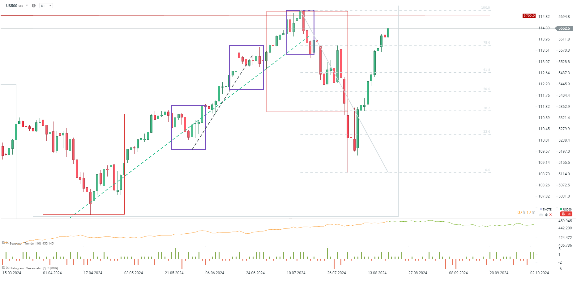 L'indice US500 est en hausse aujourd'hui, porté par l'attente de la publication des minutes du FOMC et la révision des chiffres de l'emploi par le BLS. Un compte-rendu plus restrictif, une révision significative des données sur l'emploi, ainsi que les anticipations autour du discours de Powell, qui pourrait évoquer des baisses de taux ce vendredi, sont autant de facteurs favorables à Wall Street. Depuis le 8 août, l'indice US500 a déjà progressé de 8 %, se situant actuellement à seulement 1,5 % de ses sommets historiques. La résistance la plus proche se trouve à 5 700 points, tandis que le support se situe juste au-dessus du retracement de 78,6 % de la dernière vague de baisse, autour de 5 600 points.