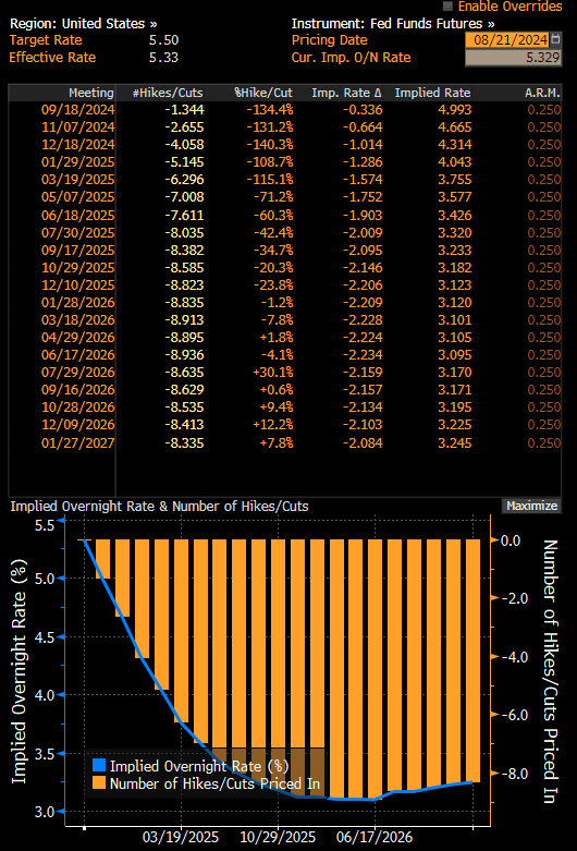 Le marché estime toujours que la probabilité d'une hausse des taux de 50 points de base en septembre est légèrement supérieure à 30 %, tandis qu'une baisse de 25 points de base est totalement intégrée dans les prix. D'ici la fin de l'année, 100 points de base de réduction des taux sont anticipés. Source : Bloomberg Finance LP Bloomberg Finance LP