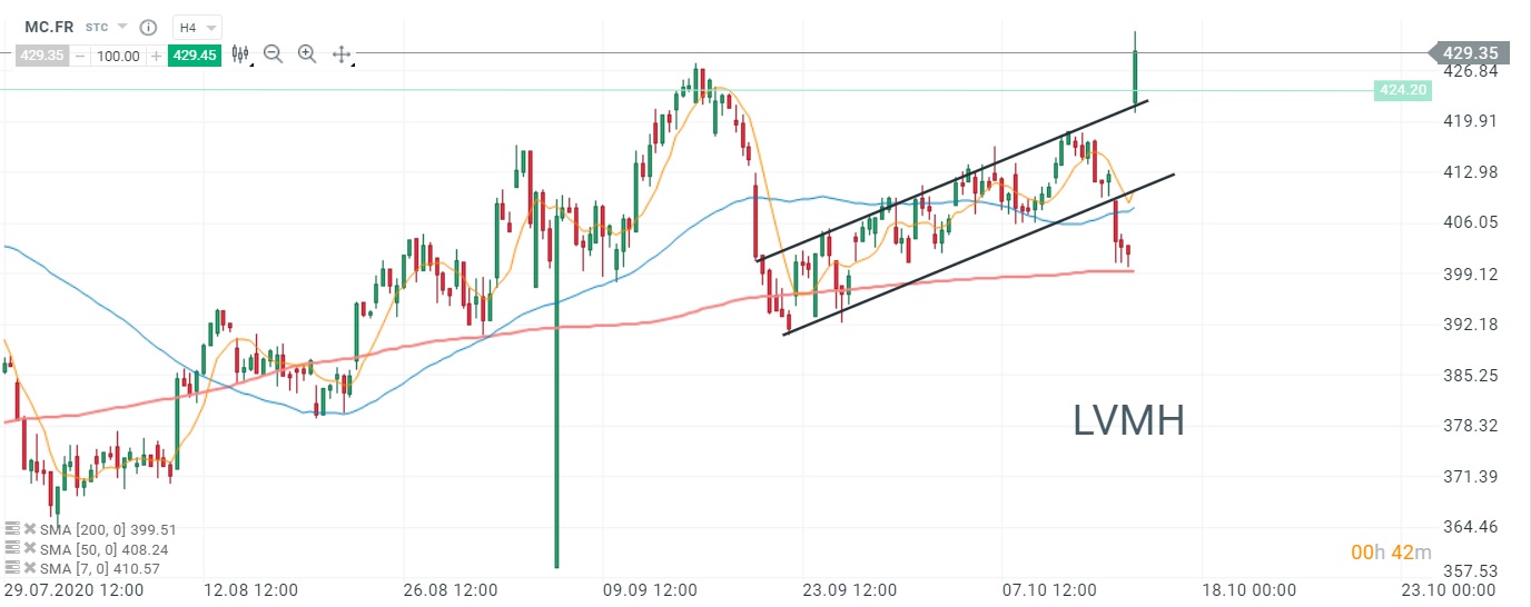 Le titre LVMH (MC.FR) a bondit pour se hisser au dessus de la borne supérieure de son précédent canal haussier, et s'affranchit des 424,20€, sommet du 12 février 2020, dernier rempart avant les 438€ . Source : xStation5