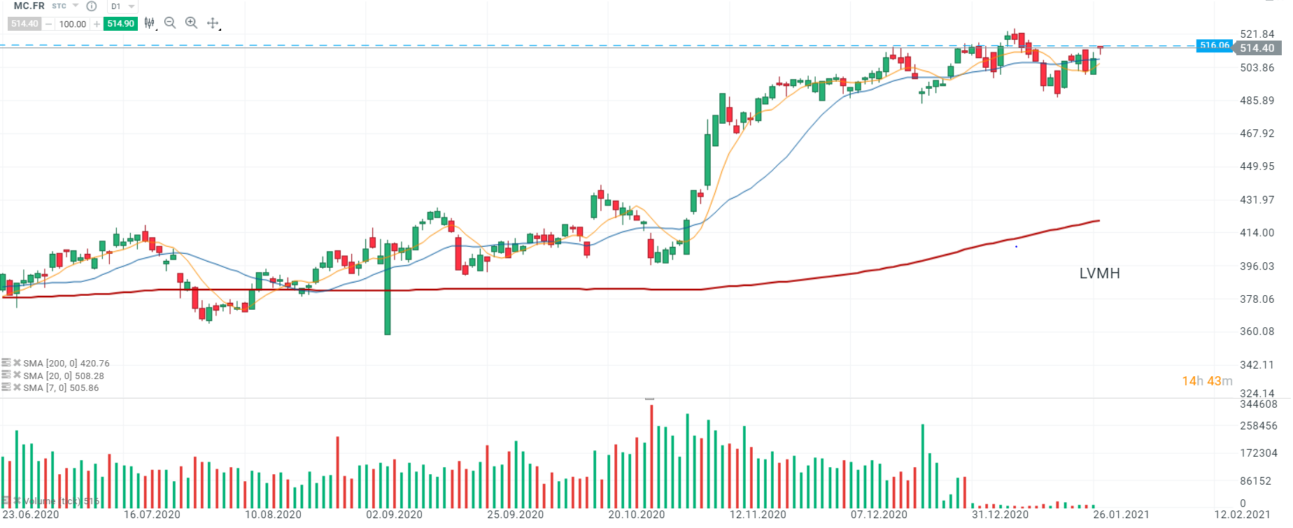 Les cours de LVMH (MC.FR) ont ouvert avec un léger gap haussier et s’attaquent actuellement à la zone de résistance au niveau des 516,06. En cas de franchissement de ce niveau, le mouvement haussier pourrait s’accélérer vers le sommet du 11/01 à 526,03. Source : xStation5