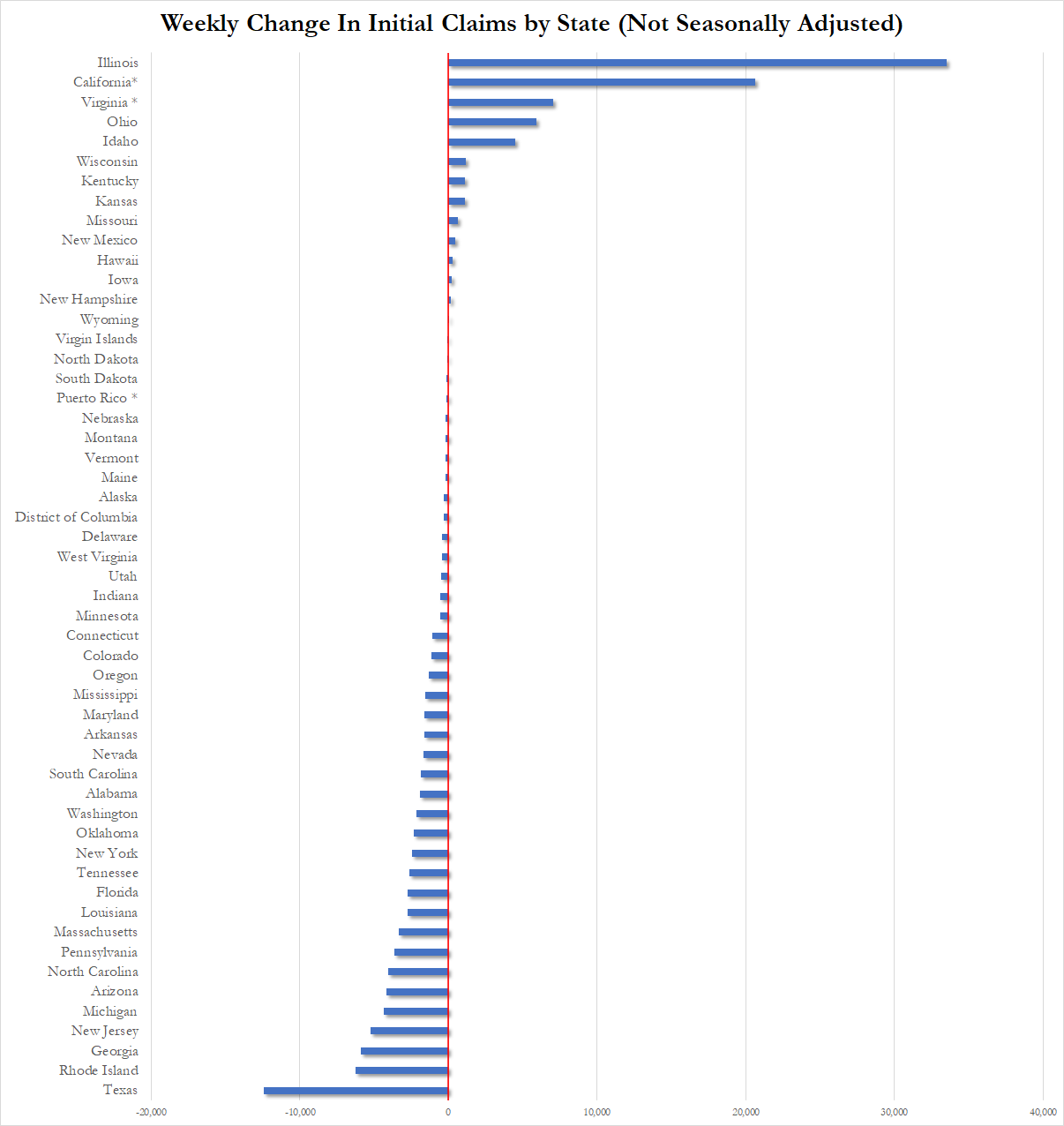 Il s'agit de la deuxième augmentation consécutive, car les restrictions liées à la COVID-19 pèsent toujours sur les entreprises dans certains États. Certains d'entre eux ont enregistré des augmentations significatives des demandes d'indemnisation la semaine dernière, l'Illinois en tête avec 33 491 et la Californie avec 20 657, selon des données non corrigées. Le Texas a enregistré une baisse de 12 428, tandis que le Rhode Island en a perdu 6 269.