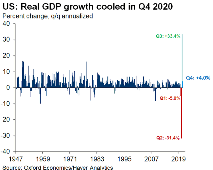 Le PIB américain a connu une croissance annualisée de 4 % au cours du dernier trimestre 2020, ralentissant par rapport à la croissance record de 33,4 % enregistrée au troisième trimestre, la hausse continue des cas COVID-19 et les restrictions d'activité ayant modéré les dépenses de consommation. Les chiffres ont été conformes aux attentes des analystes. Le chiffre reflète "à la fois la poursuite de la reprise économique après les fortes baisses du début de l'année et l'impact continu de la pandémie COVID-19, y compris les nouvelles restrictions et fermetures qui ont pris effet dans certaines régions des États-Unis" selon la BEA