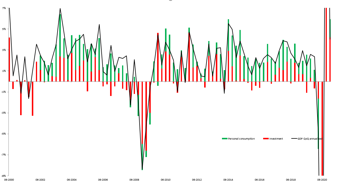 En 2020, le PIB réel a diminué de 3,5 % (du niveau annuel de 2019 au niveau annuel de 2020), contre une augmentation de 2,2 % en 2019). Il s'agit de la plus forte contraction depuis 1946, mais légèrement inférieure aux prévisions d'une baisse de 3,6 %. Les dépenses publiques, les investissements des entreprises et les investissements dans le logement sont restés robustes, mais les dépenses de consommation, les exportations et les investissements en stocks ont diminué. Les importations, une soustraction dans le calcul du PIB, ont diminué.