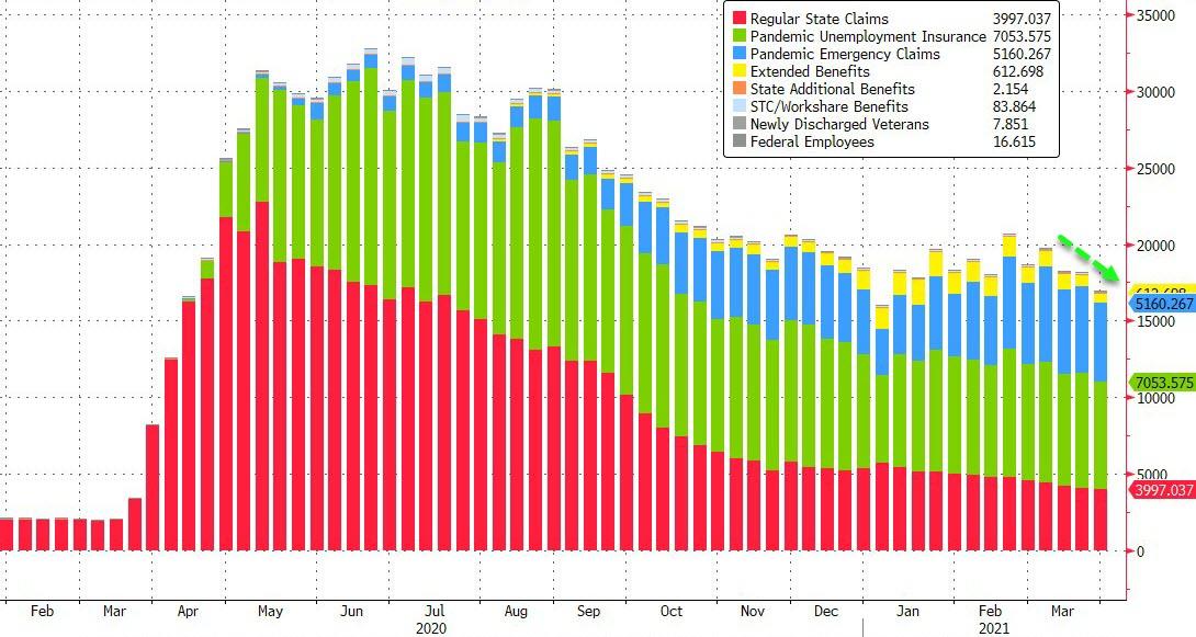 La série moins volatile des ventes au détail de base a également connu une forte hausse, de 8,4 %. Les chiffres de février ont également été révisés à la hausse pour les deux séries. La forte croissance de l'emploi a également contribué à l'augmentation des ventes au détail. Les demandes initiales d'allocations chômage ont baissé beaucoup plus que prévu la semaine dernière à 576k, ce qui est le niveau le plus bas depuis le début de la pandémie et bien en dessous des attentes des analystes qui tablaient sur 700k. Le marché du travail a été soutenu par le rythme rapide des vaccinations COVID-19, la levée des restrictions commerciales liées à la pandémie dans de nombreux États et le plan de relance de 1 900 milliards de dollars du gouvernement, qui a incité les employeurs à embaucher davantage de travailleurs pour répondre à la demande croissante. Malgré la reprise du marché du travail, 16,9 millions d'Américains continuent de percevoir des allocations de chômage, ce qui montre que des millions de personnes sont toujours confrontées à la perte d'un emploi ou de revenus.