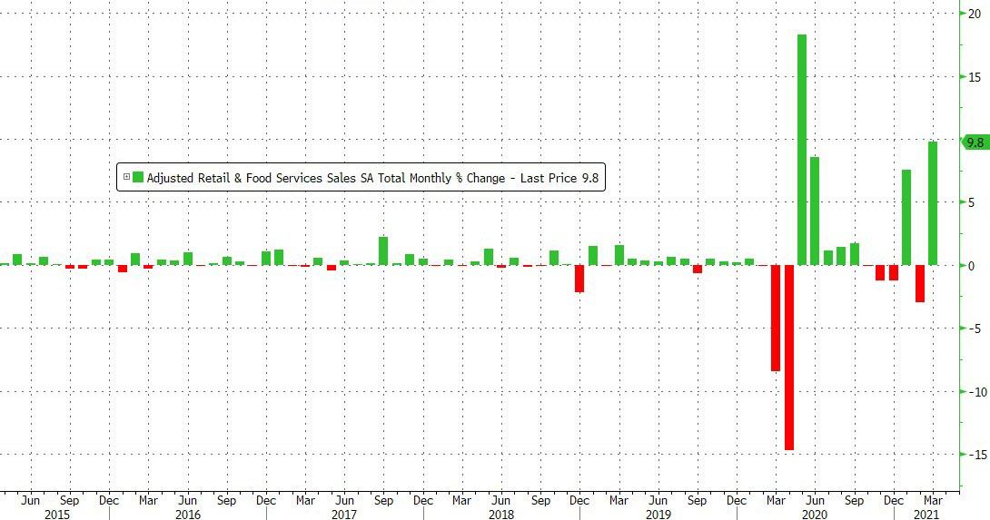 Les ventes au détail aux États-Unis ont bondi de 9,8 % en mars grâce à la combinaison d'une météo plus clémente, d'une forte croissance de l'emploi et d'une nouvelle vague de mesures de relance. Source : Blomberg via ZeroHedge